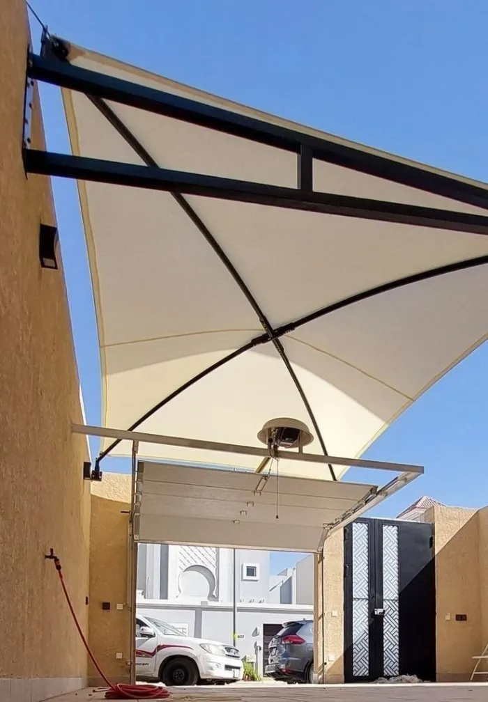يأتي قماش PVC بطبقات متعددة تسمح له بتحمل الرياح القوية ومنع اختراق المياه بنسبة 100%. كما يمكن تفصيله بأشكال هندسية متعددة مثل الهرمية، القماش المشدود، الساندويتش، والعديد من التصاميم الحديثة التي تضيف لمسة فاخرة للمكان.